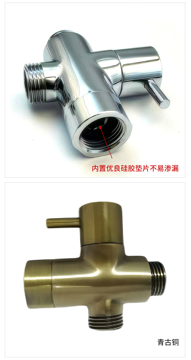 Il suo scopo principale è quello di fornire una soluzione integrata multifunzionale, a prova di perdite e facile da installare per i sistemi doccia del bagno, integrando le funzioni di deviazione dell'acqua, controllo del flusso e supporto per doccia portatile in un unico design compatto. Il prodotto adotta una struttura in ottone massiccio di elevata purezza: il canale d'acqua, i giunti filettati, il nucleo della valvola e le parti portanti che entrano direttamente in contatto con l'acqua e la parete sono realizzati in ottone di alta qualità per garantire resistenza alla corrosione a lungo termine, prevenzione della ruggine, zero perdite d'acqua e funzionamento stabile. La superficie del prodotto è trattata mediante processi di cromatura e lucidatura, mostrando un aspetto cromato brillante a specchio, antivegetativa, resistente alle impronte digitali e facile da pulire.